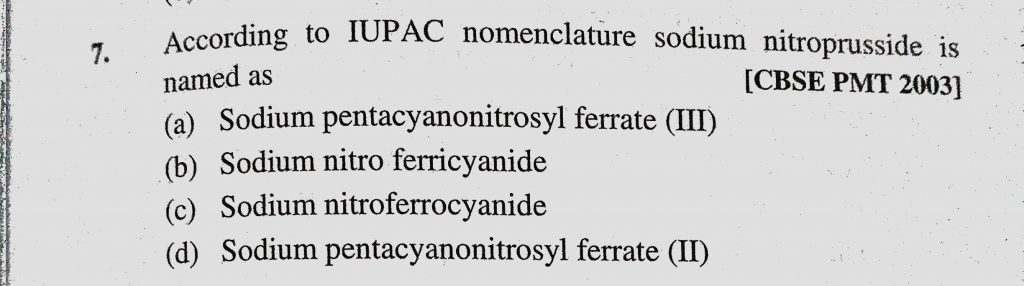 According to IUPAC nomenclature sodium nitroprusside is named as (a) Sodium pentacyanonitrosyl ferrate (III) According to IUPAC nomenclature sodium nitroprusside is named as (a) Sodium pentacyanonitrosyl ferrate (III) December 3, 2020 Category: Uncategorised (JEE Advanced Physics by BM Sharma + GMP Solutions) , Facebook Messenger WhatsApp Share this:TwitterFacebook Related