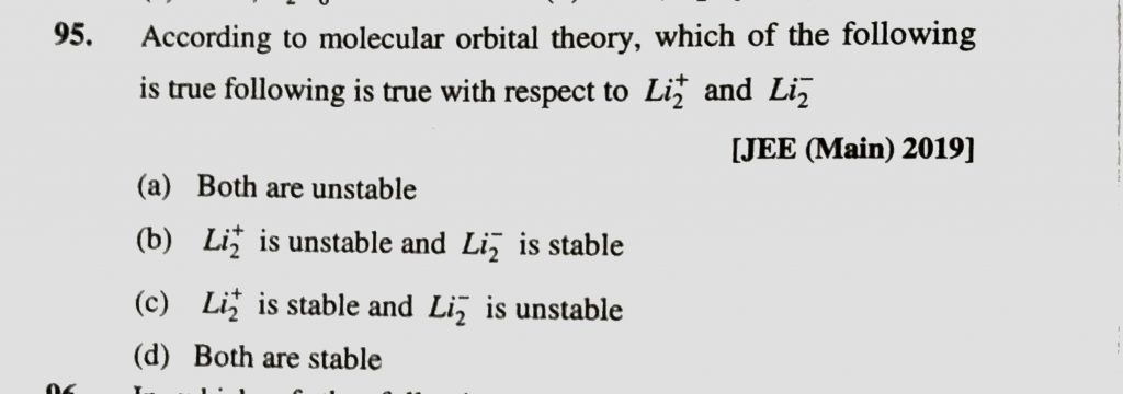 According to molecular orbital theory, which of the following is true following is true with respect to Li2^+ and Li2^- According to molecular orbital theory which of the following is true following is true with respect to Li2^+ and Li2^- December 15, 2020 Category: Uncategorised (JEE Advanced Physics by BM Sharma + GMP Solutions) , Facebook Messenger WhatsApp Share this:TwitterFacebook Related