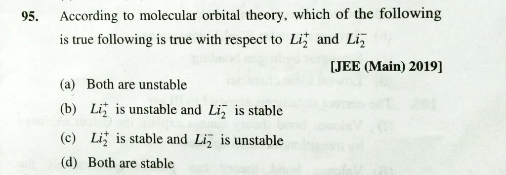 According to molecular orbital theory , which of the following is true following is true with respect to Li2^+ and Li2^- According to molecular orbital theory which of the following is true following is true with respect to Li2^+ and Li2^- December 10, 2020 Category: Uncategorised (JEE Advanced Physics by BM Sharma + GMP Solutions) , Facebook Messenger WhatsApp Share this:TwitterFacebook Related