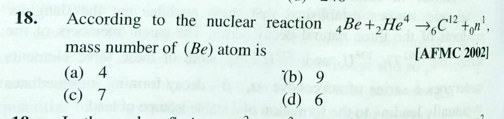 According to the nuclear reaction 4Be +2He^4 gives 6C^12 +0n^1 , mass number of (Be ) atom is (a) 4 (b) 9 (c)) 7 (d) 6 According to the nuclear reaction 4Be +2He^4 gives 6C^12 +0n^1 mass number of (Be ) atom is (a) 4 (b) 9 (c)) 7 (d) 6 February 13, 2021 Category: Uncategorised (JEE Advanced Physics by BM Sharma + GMP Solutions) , Facebook Messenger WhatsApp Share this:TwitterFacebook Related