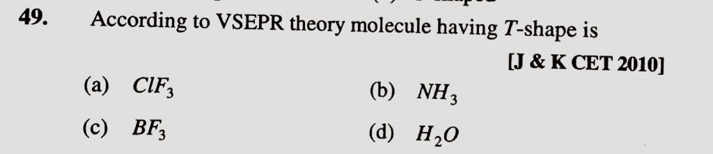 According to VSEPR theory molecule having T – shaped is (a) CLF3 (b) NH3 (c) BF3 (d) H2O According to VSEPR theory molecule having T - shaped is (a) CLF3 (b) NH3 (c) BF3 (d) H2O December 7, 2020 Category: Uncategorised (JEE Advanced Physics by BM Sharma + GMP Solutions) , Facebook Messenger WhatsApp Share this:TwitterFacebook Related