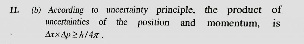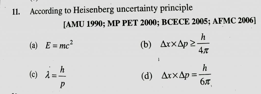 Accoring to Heisenberg uncertainity principle (a) E = mc^2 (b) deltaX x delta P > h/4 pie (c) Lamda = h/p Accoring to Heisenberg uncertainity principle (a) E = mc^2 (b) deltaX x delta P > h/4 pie (c) Lamda = h/p November 28, 2020 Category: Uncategorised (JEE Advanced Physics by BM Sharma + GMP Solutions) , Facebook Messenger WhatsApp Share this:TwitterFacebook Related