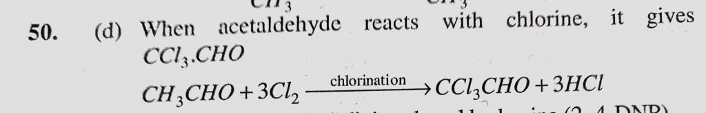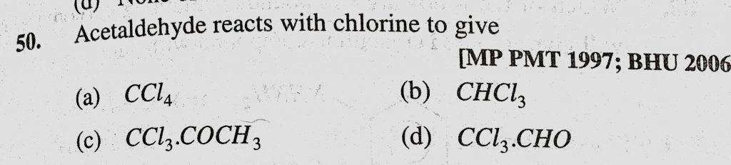 Acetaldehyde reacts with chlorine to give (a) CCl4 (b) CHCl3 (c) CCl3.COCH3 (d) CCl3.CHO Acetaldehyde reacts with chlorine to give (a) CCl4 (b) CHCl3 (c) CCl3.COCH3 (d) CCl3.CHO February 11, 2021 Category: Uncategorised (JEE Advanced Physics by BM Sharma + GMP Solutions) , Facebook Messenger WhatsApp Share this:TwitterFacebook Related