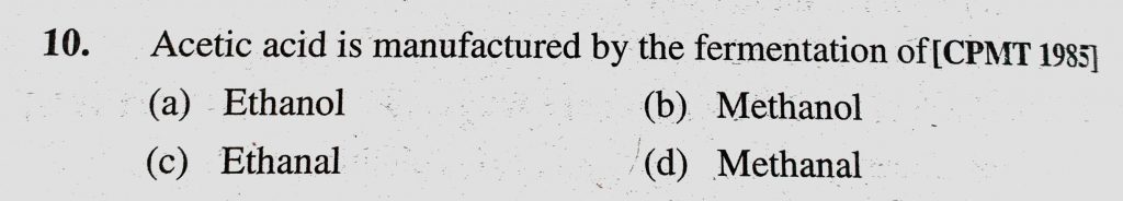 Acetic acid is manufactured by the fermentation of (a) Ethanol (b) Methanol (c) Ethanal (d) Methanal Acetic acid is manufactured by the fermentation of (a) Ethanol (b) Methanol (c) Ethanal (d) Methanal February 13, 2021 Category: Uncategorised (JEE Advanced Physics by BM Sharma + GMP Solutions) , Facebook Messenger WhatsApp Share this:TwitterFacebook Related