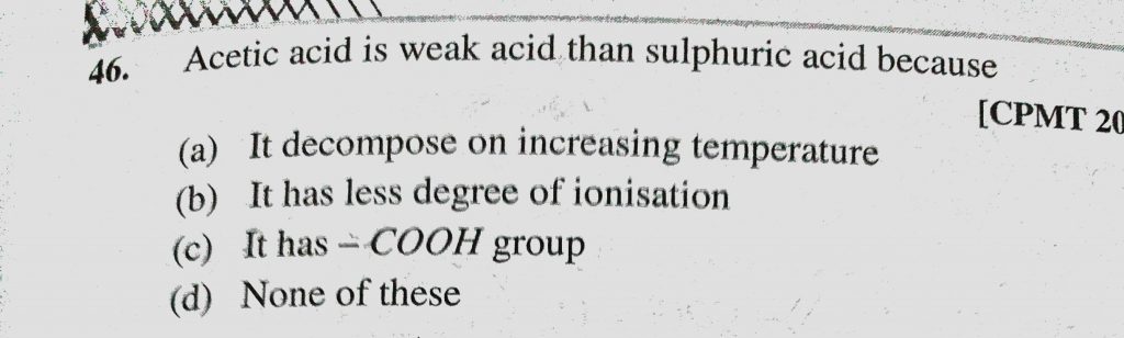 Acetic acid is weak acid than sulphuric acid because (a) It decompose on increasing temperature (b) It has less degree of ionisation (c) It has -COOH group (d) None of these Acetic acid is weak acid than sulphuric acid because (a) It decompose on increasing temperature (b) It has less degree of ionisation (c) It has -COOH group (d) None of these February 13, 2021 Category: Uncategorised (JEE Advanced Physics by BM Sharma + GMP Solutions) , Facebook Messenger WhatsApp Share this:TwitterFacebook Related