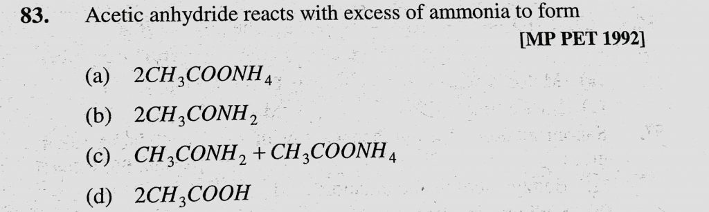 Acetic anhydride reacts with excess of ammonia to form (a) 2CH3COONH4 (b) 2CH3CONH2 (c) CH3CONH2 + CH3COONH4 (d) 2CH3COOH Acetic anhydride reacts with excess of ammonia to form (a) 2CH3COONH4 (b) 2CH3CONH2 (c) CH3CONH2 + CH3COONH4 (d) 2CH3COOH February 13, 2021 Category: Uncategorised (JEE Advanced Physics by BM Sharma + GMP Solutions) , Facebook Messenger WhatsApp Share this:TwitterFacebook Related