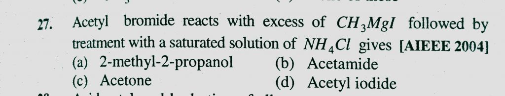 Acetyl bromide reacts with excess of CH3MgI followed by treatment with a saturated solution of NH4Cl gives (a) 2-methyl-2-propanol (b) Acetamide (c) Acetone (d) Acetyl iodide Acetyl bromide reacts with excess of CH3MgI followed by treatment with a saturated solution of NH4Cl gives (a) 2-methyl-2-propanol (b) Acetamide (c) Acetone (d) Acetyl iodide February 10, 2021 Category: Uncategorised (JEE Advanced Physics by BM Sharma + GMP Solutions) , Facebook Messenger WhatsApp Share this:TwitterFacebook Related