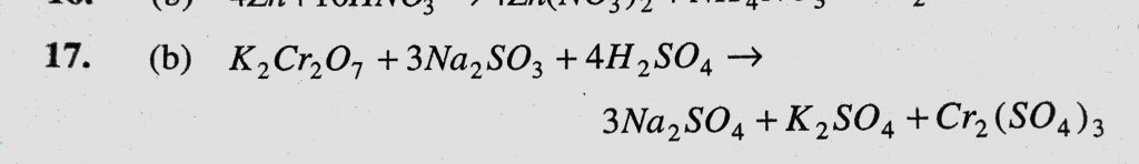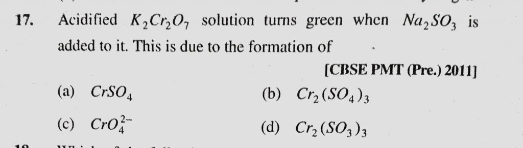 Acidified K2Cr2O7 solution turns green when Na2SO3 is added to it. This is due to the formation of (a) CrSO4 (b) Cr2(SO4)3 (c) CrO4 2- Acidified K2Cr2O7 solution turns green when Na2SO3 is added to it. This is due to the formation of (a) CrSO4 (b) Cr2(SO4)3 (c) CrO4 2- December 1, 2020 Category: Uncategorised (JEE Advanced Physics by BM Sharma + GMP Solutions) , Facebook Messenger WhatsApp Share this:TwitterFacebook Related