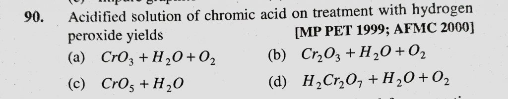Acidified solution of chromic acid on treatment with hydrogen peroxide yields (a) CrO3 + H2O + O2 (b) Cr2O3 + H2O + O2 Acidified solution of chromic acid on treatment with hydrogen peroxide yields (a) CrO3 + H2O + O2 (b) Cr2O3 + H2O + O2 December 1, 2020 Category: Uncategorised (JEE Advanced Physics by BM Sharma + GMP Solutions) , Facebook Messenger WhatsApp Share this:TwitterFacebook Related