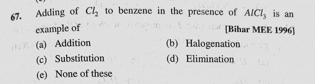 Adding of Cl2 to benzene in the presence of AlCl3 is an example of (a) Addition (b) Halogenation (c) Substitution (d) Elimination (e) None of these Adding of Cl2 to benzene in the presence of AlCl3 is an example of (a) Addition (b) Halogenation (c) Substitution (d) Elimination (e) None of these December 15, 2020 Category: Uncategorised (JEE Advanced Physics by BM Sharma + GMP Solutions) , Facebook Messenger WhatsApp Share this:TwitterFacebook Related