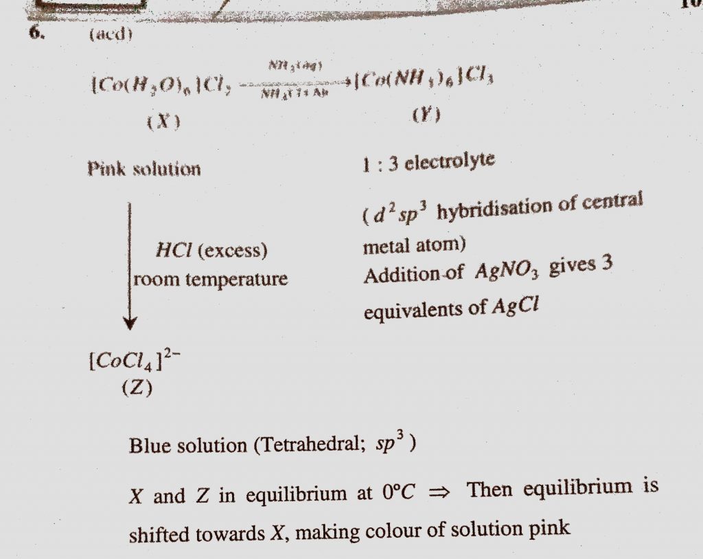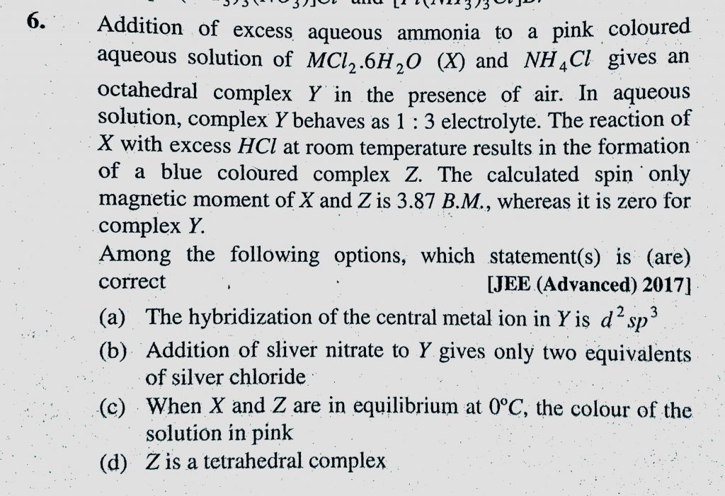 Addition of excess aqueous ammonia to a pink coloured aqueous solution of MCl2.6H2O (X) and NH4Cl gives an octahedral complex Y in the presence of air. In aqueous solution, complex Y behaves a 1 : 3 electrolyte. Addition of excess aqueous ammonia to a pink coloured aqueous solution of MCl2.6H2O (X) and NH4Cl gives an octahedral complex Y in the presence of air. In aqueous solution complex Y behaves a 1 : 3 electrolyte. December 6, 2020 Category: Uncategorised (JEE Advanced Physics by BM Sharma + GMP Solutions) , Facebook Messenger WhatsApp Share this:TwitterFacebook Related