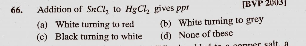 Addition of SnCl2 to HgCl2 gives ppt (a) White turning to red (b) White turning to grey Addition of SnCl2 to HgCl2 gives ppt (a) White turning to red (b) White turning to grey December 7, 2020 Category: Uncategorised (JEE Advanced Physics by BM Sharma + GMP Solutions) , Facebook Messenger WhatsApp Share this:TwitterFacebook Related