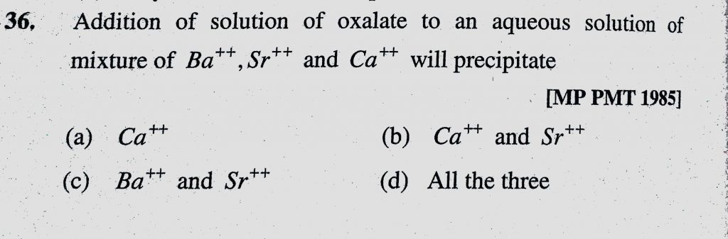 Addition of solution of oxalate to an aqueous solution of mixture of Ba++, Sr++ and Ca++ will precipitate (a) Ca++ (b) Ca++ and Sr ++ Addition of solution of oxalate to an aqueous solution of mixture of Ba++ Sr++ and Ca++ will precipitate (a) Ca++ (b) Ca++ and Sr ++ December 6, 2020 Category: Uncategorised (JEE Advanced Physics by BM Sharma + GMP Solutions) , Facebook Messenger WhatsApp Share this:TwitterFacebook Related