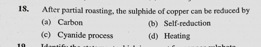 After partial roasting, the sulphide of copper can be reduced by (a) Carbon (b) Self-reduction (c) Cyanide process (d) Heating After partial roasting the sulphide of copper can be reduced by (a) Carbon (b) Self-reduction (c) Cyanide process (d) Heating December 3, 2020 Category: Uncategorised (JEE Advanced Physics by BM Sharma + GMP Solutions) , Facebook Messenger WhatsApp Share this:TwitterFacebook Related