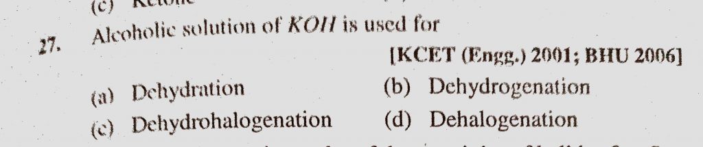 Alcoholic solution of KOH is used for (a) Dehydration (b) Dehydrogenation (c) Dehydrohalogenation (d) Dehalogenation Alcoholic solution of KOH is used for (a) Dehydration (b) Dehydrogenation (c) Dehydrohalogenation (d) Dehalogenation February 8, 2021 Category: Uncategorised (JEE Advanced Physics by BM Sharma + GMP Solutions) , Facebook Messenger WhatsApp Share this:TwitterFacebook Related