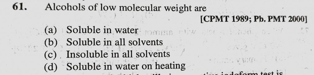 Alcohols of low molecular weight are (a) Soluble in water (b) Soluble in all solvents (c) Insoluble in all solvents (d) Soluble in water on heating Alcohols of low molecular weight are (a) Soluble in water (b) Soluble in all solvents (c) Insoluble in all solvents (d) Soluble in water on heating February 11, 2021 Category: Uncategorised (JEE Advanced Physics by BM Sharma + GMP Solutions) , Facebook Messenger WhatsApp Share this:TwitterFacebook Related