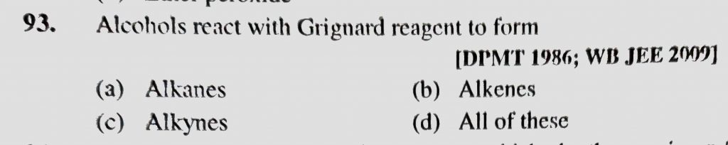 Alcohols react with Grignard reagent to form (a) Alkanes (b) Alkenes (c) Alkynes (d) All of these Alcohols react with Grignard reagent to form (a) Alkanes (b) Alkenes (c) Alkynes (d) All of these February 13, 2021 Category: Uncategorised (JEE Advanced Physics by BM Sharma + GMP Solutions) , Facebook Messenger WhatsApp Share this:TwitterFacebook Related