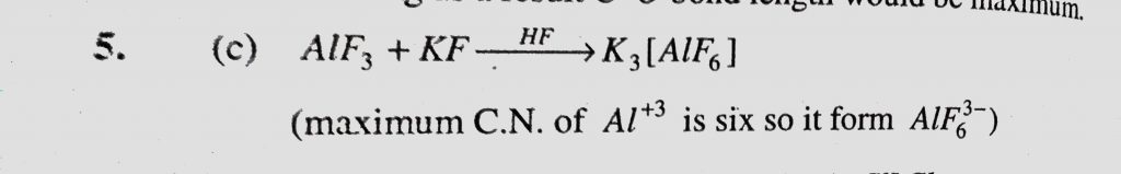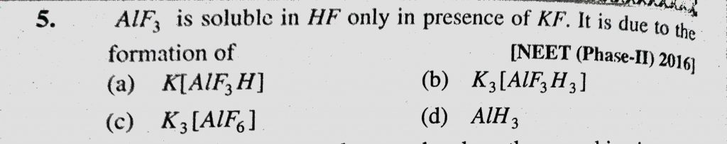 AlF3 is soluble in HF only in presence of KF. It is due to the formation of (a) K (AlF3H) (b) K3(AlF3H3) AlF3 is soluble in HF only in presence of KF. It is due to the formation of (a) K (AlF3H) (b) K3(AlF3H3) December 5, 2020 Category: Uncategorised (JEE Advanced Physics by BM Sharma + GMP Solutions) , Facebook Messenger WhatsApp Share this:TwitterFacebook Related