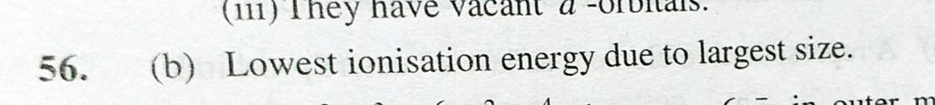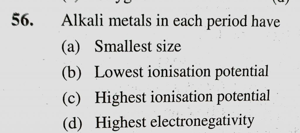 Alkali metals in each period have (a) Smallest size (b) Lowest ionisation potential (c) Highest ionisation potential (d) Highest electronegativity Alkali metals in each period have (a) Smallest size (b) Lowest ionisation potential (c) Highest ionisation potential (d) Highest electronegativity November 8, 2020 Category: Uncategorised (JEE Advanced Physics by BM Sharma + GMP Solutions) , Facebook Messenger WhatsApp Share this:TwitterFacebook Related