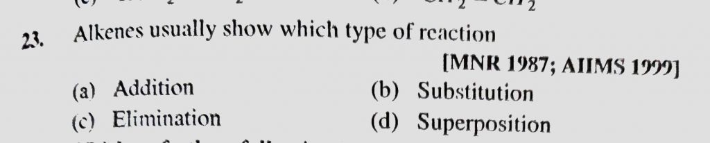 Alkenes usually show which type of reaction (a) Addition (b) Substitution (c) Elimination (d) Superposition Alkenes usually show which type of reaction (a) Addition (b) Substitution (c) Elimination (d) Superposition December 13, 2020 Category: Uncategorised (JEE Advanced Physics by BM Sharma + GMP Solutions) , Facebook Messenger WhatsApp Share this:TwitterFacebook Related