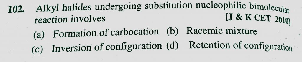 Alkyl halides undergoing substitution nucleophilic bimolecular reaction involves (a) Formation of carbocation (b) Racemic mixture (c) Inversion of configuration Alkyl halides undergoing substitution nucleophilic bimolecular reaction involves (a) Formation of carbocation (b) Racemic mixture (c) Inversion of configuration February 8, 2021 Category: Uncategorised (JEE Advanced Physics by BM Sharma + GMP Solutions) , Facebook Messenger WhatsApp Share this:TwitterFacebook Related