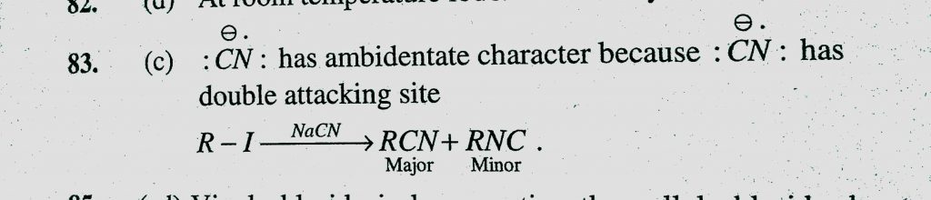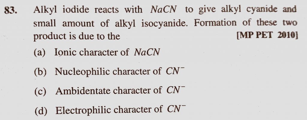 Alkyl iodide reacts with NaCN to give alkyl cyanide and small amount of alkyl isocyanide. Formation of these two product is due to the (a) Ionic character of NaCN Alkyl iodide reacts with NaCN to give alkyl cyanide and small amount of alkyl isocyanide. Formation of these two product is due to the (a) Ionic character of NaCN February 8, 2021 Category: Uncategorised (JEE Advanced Physics by BM Sharma + GMP Solutions) , Facebook Messenger WhatsApp Share this:TwitterFacebook Related