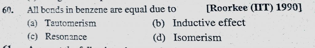 All bonds in benzene are equal due to (a) Tautomerism (b) Inductive effect (c) Resonance (d) Isomerism All bonds in benzene are equal due to (a) Tautomerism (b) Inductive effect (c) Resonance (d) Isomerism December 11, 2020 Category: Uncategorised (JEE Advanced Physics by BM Sharma + GMP Solutions) , Facebook Messenger WhatsApp Share this:TwitterFacebook Related