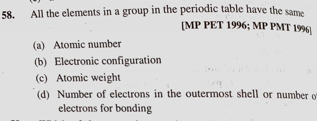 All the elements in a group in the periodic table have the same (a) Atomic number (b) Electronic configuration (c) Atomic weight (d) Number of electrons in the outermost shell All the elements in a group in the periodic table have the same (a) Atomic number (b) Electronic configuration (c) Atomic weight (d) Number of electrons in the outermost shell November 8, 2020 Category: Uncategorised (JEE Advanced Physics by BM Sharma + GMP Solutions) , Facebook Messenger WhatsApp Share this:TwitterFacebook Related