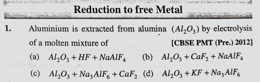 Aluminium is extracted from alumina (Al2O3) by electrolysis of a molten mixture of (a) Al2O3 + HF + NaAlF4 (b) Al2O3 + CaF2 + NaAlF4 Aluminium is extracted from alumina (Al2O3) by electrolysis of a molten mixture of (a) Al2O3 + HF + NaAlF4 (b) Al2O3 + CaF2 + NaAlF4 November 12, 2020 Category: Uncategorised (JEE Advanced Physics by BM Sharma + GMP Solutions) , Facebook Messenger WhatsApp Share this:TwitterFacebook Related