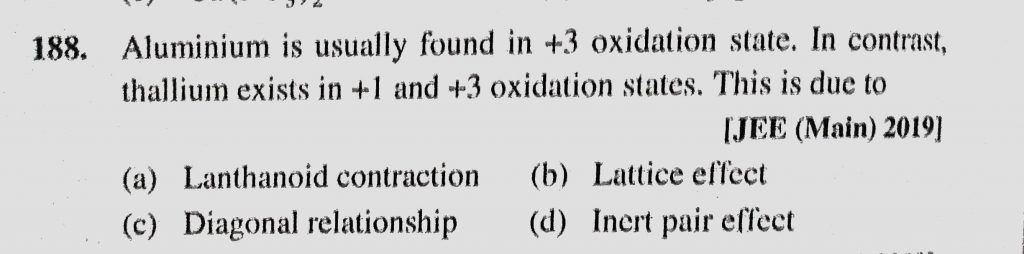 Aluminium is usually found in +3 oxidation state. In contrast, thallium exists in +1 and +3 oxidation states. This is due to (a) Lanthanoid contraction Aluminium is usually found in +3 oxidation state. In contrast thallium exists in +1 and +3 oxidation states. This is due to (a) Lanthanoid contraction November 28, 2020 Category: Uncategorised (JEE Advanced Physics by BM Sharma + GMP Solutions) , Facebook Messenger WhatsApp Share this:TwitterFacebook Related