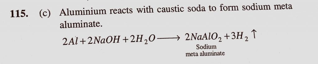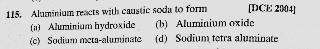 Aluminium reacts with caustic soda to form (a) Aluminium hydroxide (b) Aluminium oxide (c) Sodiu meta-aluminate (d) Sodium tetra aluminate Aluminium reacts with caustic soda to form (a) Aluminium hydroxide (b) Aluminium oxide (c) Sodiu meta-aluminate (d) Sodium tetra aluminate November 15, 2020 Category: Uncategorised (JEE Advanced Physics by BM Sharma + GMP Solutions) , Facebook Messenger WhatsApp Share this:TwitterFacebook Related