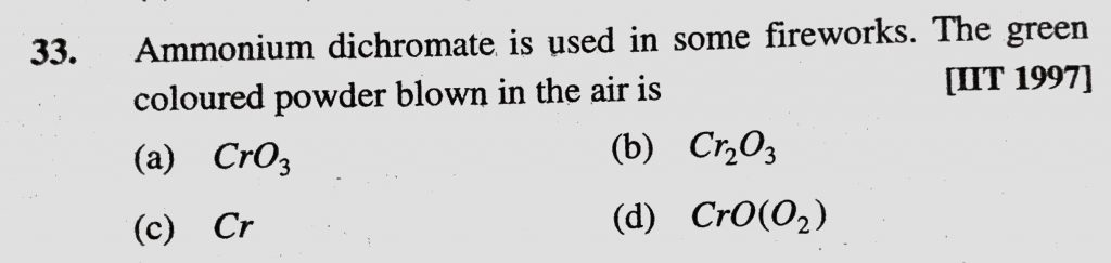 Ammonium dichromate is used in some fireworks. The green coloured powder blown in the air is (a) CrO3 (b) Cr2O3 Ammonium dichromate is used in some fireworks. The green coloured powder blown in the air is (a) CrO3 (b) Cr2O3 December 5, 2020 Category: Uncategorised (JEE Advanced Physics by BM Sharma + GMP Solutions) , Facebook Messenger WhatsApp Share this:TwitterFacebook Related