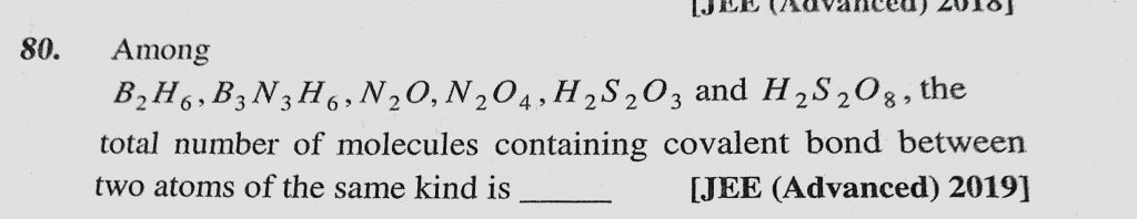 Among B2H6, B3N3H6, N2O, N2O4, H2S2O3 and H2S2O8, the total number of molecules containing covalent bond between two atoms of the same kind is ………………… Among B2H6 B3N3H6 H2S2O3 and H2S2O8 N2O N2O4 the total number of molecules containing covalent bond between two atoms of the same kind is ..................... November 29, 2020 Category: Uncategorised (JEE Advanced Physics by BM Sharma + GMP Solutions) , Facebook Messenger WhatsApp Share this:TwitterFacebook Related