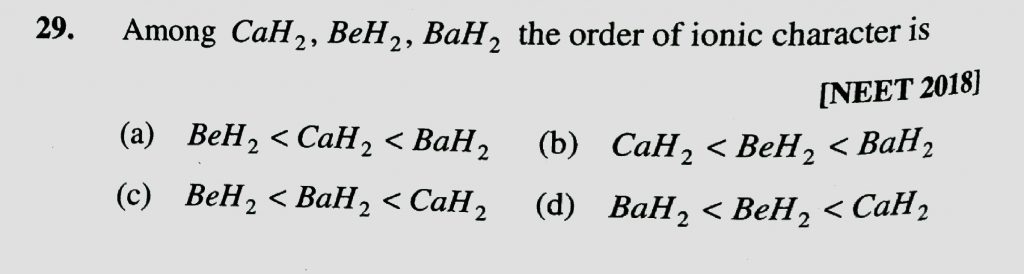 Among CaH2 , BeH2 , BaH2 the order of ionic character is Among CaH2 BaH2 the order of ionic character is BeH2 December 2, 2020 Category: Uncategorised (JEE Advanced Physics by BM Sharma + GMP Solutions) , Facebook Messenger WhatsApp Share this:TwitterFacebook Related
