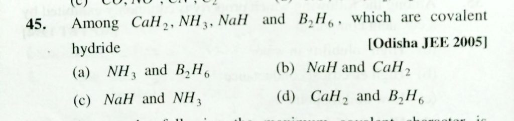 Among CaH2 , NH3 , NaH and B2H6 , which are covalent hydride Among CaH2 NaH and B2H6 NH3 which are covalent hydride December 1, 2020 Category: Uncategorised (JEE Advanced Physics by BM Sharma + GMP Solutions) , Facebook Messenger WhatsApp Share this:TwitterFacebook Related