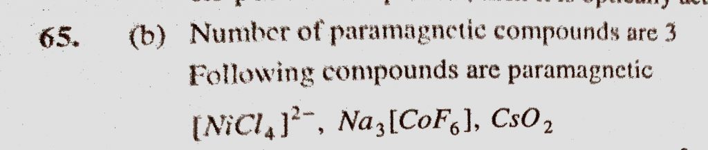 Among (Ni(CO)4), (NiCl4) 2-, (Co(NH3)4Cl2)Cl, Na3(CoF6), Na2O2 and CsO2, the total number of paramagnetic compounds is (Co(NH3)4Cl2)Cl (NiCl4) 2- Among (Ni(CO)4) Na2O2 and CsO2 Na3(CoF6) the total number of paramagnetic compounds is December 5, 2020 Category: Uncategorised (JEE Advanced Physics by BM Sharma + GMP Solutions) , Facebook Messenger WhatsApp Share this:TwitterFacebook Related