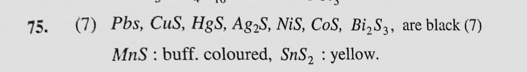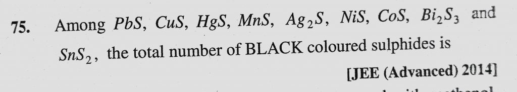 Among PbS, CuS, HgS, MnS, Ag2S, NiS, CoS, Bi2S3 and SnS2, the total number of BLACK coloured sulphides is Ag2S Among PbS Bi2S3 and SnS2 CoS CuS HgS MnS NiS the total number of BLACK coloured sulphides is November 29, 2020 Category: Uncategorised (JEE Advanced Physics by BM Sharma + GMP Solutions) , Facebook Messenger WhatsApp Share this:TwitterFacebook Related
