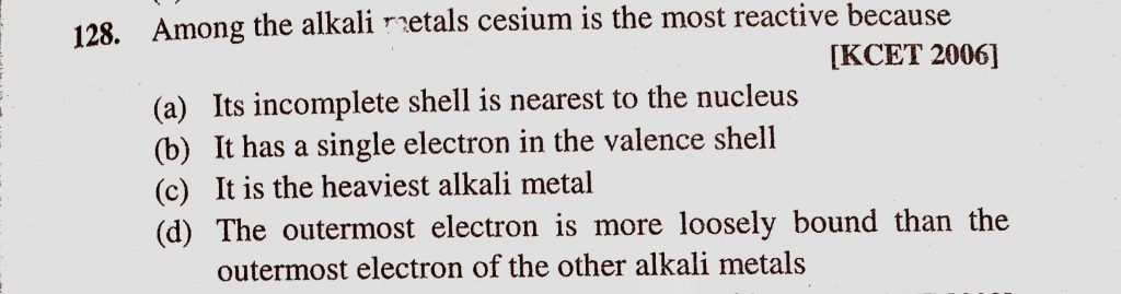 Among the alkali metals cesium is the most reactive because (a) Its incomplete shell is nearest to the nucleus Among the alkali metals cesium is the most reactive because (a) Its incomplete shell is nearest to the nucleus November 15, 2020 Category: Uncategorised (JEE Advanced Physics by BM Sharma + GMP Solutions) , Facebook Messenger WhatsApp Share this:TwitterFacebook Related