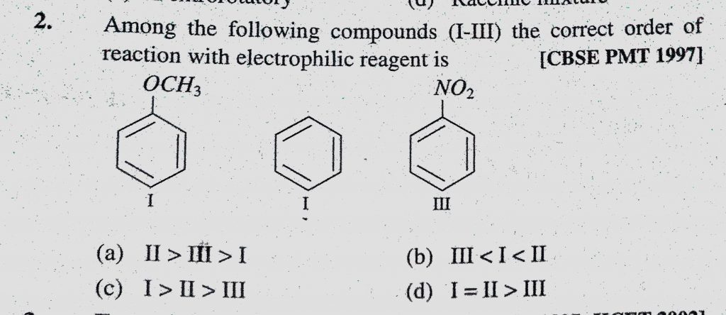 Among the following compounds (I-III) the correct order of reaction with electrophilic reagent is Among the following compounds (I-III) the correct order of reaction with electrophilic reagent is December 11, 2020 Category: Uncategorised (JEE Advanced Physics by BM Sharma + GMP Solutions) , Facebook Messenger WhatsApp Share this:TwitterFacebook Related