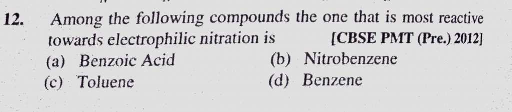 Among the following compounds the one that is most reactive towards electrophilic nitration is (a) Benzoic Acid (b) Nitrobenzene (c) Toluene Among the following compounds the one that is most reactive towards electrophilic nitration is (a) Benzoic Acid (b) Nitrobenzene (c) Toluene December 9, 2020 Category: Uncategorised (JEE Advanced Physics by BM Sharma + GMP Solutions) , Facebook Messenger WhatsApp Share this:TwitterFacebook Related