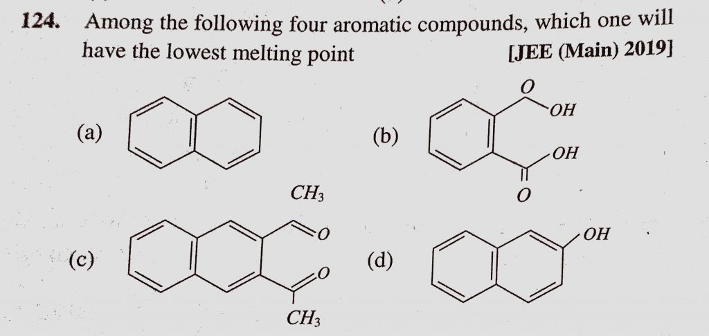Among the following four aromatic compounds, which one will have the lowest melting point Among the following four aromatic compounds which one will have the lowest melting point December 12, 2020 Category: Uncategorised (JEE Advanced Physics by BM Sharma + GMP Solutions) , Facebook Messenger WhatsApp Share this:TwitterFacebook Related