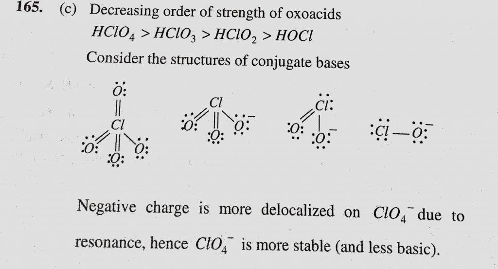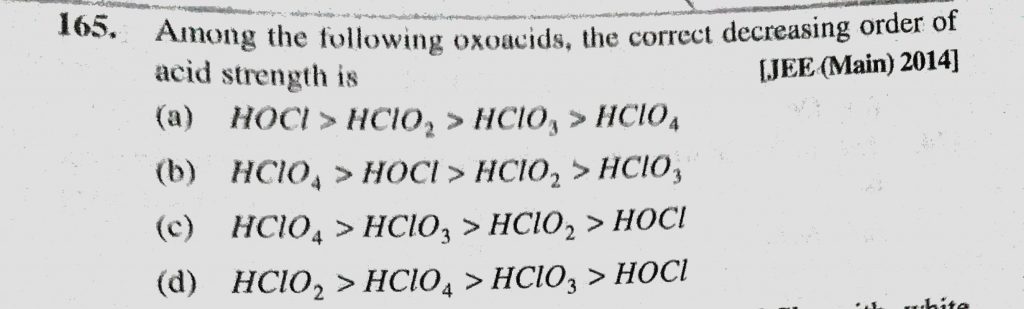 Among the following oxoacids, the correct decreasing order of acid strength is (a) HOCl > HClO2 > HClO3 > HClO4 Among the following oxoacids the correct decreasing order of acid strength is (a) HOCl > HClO2 > HClO3 > HClO4 November 28, 2020 Category: Uncategorised (JEE Advanced Physics by BM Sharma + GMP Solutions) , Facebook Messenger WhatsApp Share this:TwitterFacebook Related