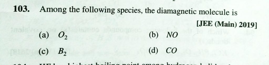 Among the following species , the diamagnetic molecule is (a) O2 (b) NO (c) B2 (d) CO Among the following species the diamagnetic molecule is (a) O2 (b) NO (c) B2 (d) CO December 10, 2020 Category: Uncategorised (JEE Advanced Physics by BM Sharma + GMP Solutions) , Facebook Messenger WhatsApp Share this:TwitterFacebook Related