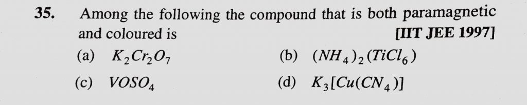 Among the following the compound that is both paramagnetic and coloured is (a) K2Cr2O7 (b) (NH4)2 (TiCl6) Among the following the compound that is both paramagnetic and coloured is (a) K2Cr2O7 (b) (NH4)2 (TiCl6) December 2, 2020 Category: Uncategorised (JEE Advanced Physics by BM Sharma + GMP Solutions) , Facebook Messenger WhatsApp Share this:TwitterFacebook Related