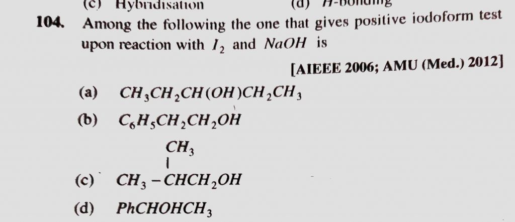 Among the following the one that gives positive iodoform test upon reaction with I2 and NaOH is Among the following the one that gives positive iodoform test upon reaction with I2 and NaOH is February 13, 2021 Category: Uncategorised (JEE Advanced Physics by BM Sharma + GMP Solutions) , Facebook Messenger WhatsApp Share this:TwitterFacebook Related