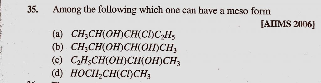 Among the following which one can have a meso form (a) CH3CH(OH)CH(Cl)C2H5 (b) CH3CH(OH)CH(OH)CH3 Among the following which one can have a meso form (a) CH3CH(OH)CH(Cl)C2H5 (b) CH3CH(OH)CH(OH)CH3 December 10, 2020 Category: Uncategorised (JEE Advanced Physics by BM Sharma + GMP Solutions) , Facebook Messenger WhatsApp Share this:TwitterFacebook Related