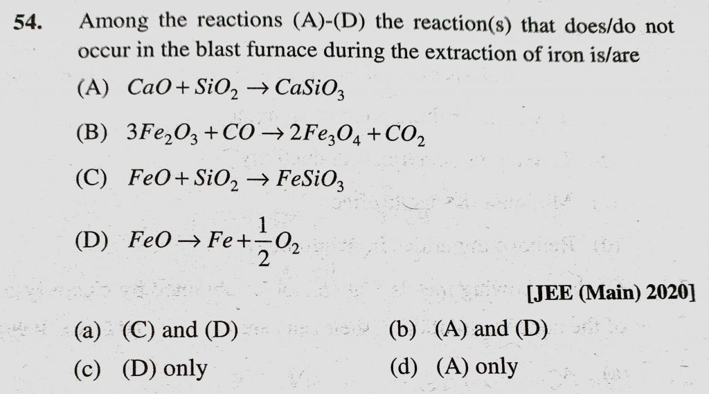 Among the reactions (A) – (D) the reaction(s) that does/do not occur in the blast furnace during the extraction of iron is/are(a) CaO + SiO2 to CaSiO3 Among the reactions (A) - (D) the reaction(s) that does/do not occur in the blast furnace during the extraction of iron is/are(a) CaO + SiO2 to CaSiO3 November 12, 2020 Category: Uncategorised (JEE Advanced Physics by BM Sharma + GMP Solutions) , Facebook Messenger WhatsApp Share this:TwitterFacebook Related