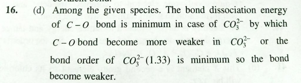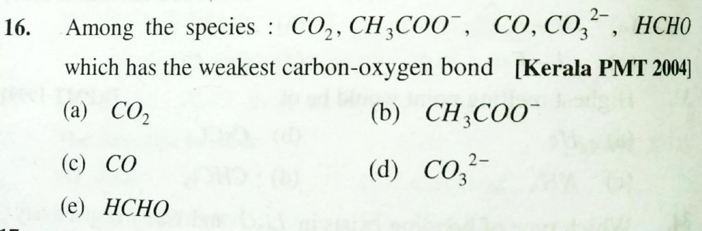 Among the species : CO2 , CH3COO^- , CO , CO3^2- , which has the weakest carbon – oxygen bond Among the species : CO2 CH3COO^- Co CO3^2- which has the weakest carbon - oxygen bond December 1, 2020 Category: Uncategorised (JEE Advanced Physics by BM Sharma + GMP Solutions) , Facebook Messenger WhatsApp Share this:TwitterFacebook Related