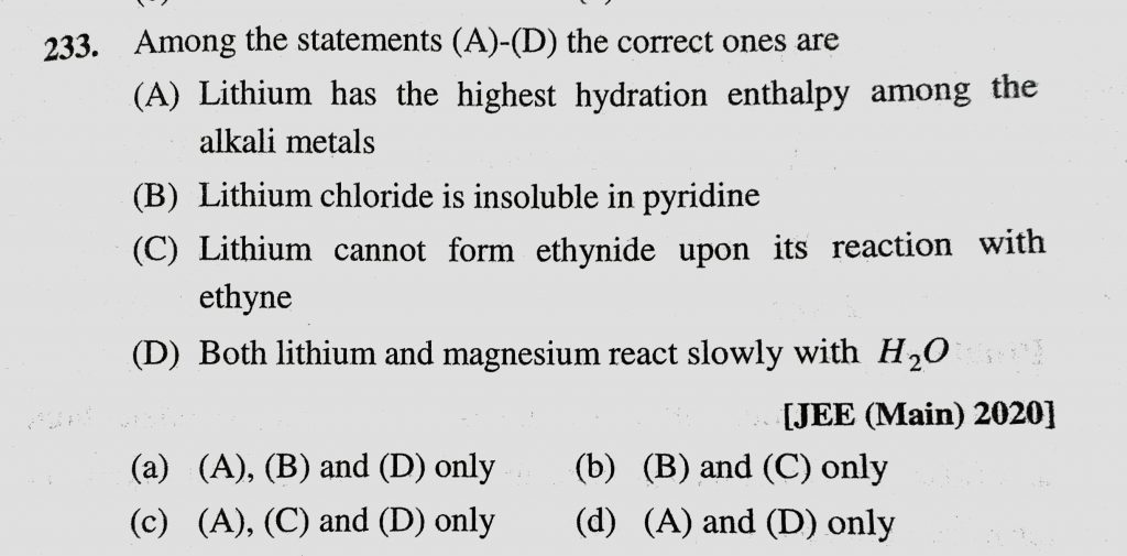 Among the statements (A)-(D) the correct ones are (a) Lithium has the highest hydration enthalpy among the alkali metals (B) Lithium chloride is insoluble in pyridine Among the statements (A)-(D) the correct ones are (a) Lithium has the highest hydration enthalpy among the alkali metals (B) Lithium chloride is insoluble in pyridine November 28, 2020 Category: Uncategorised (JEE Advanced Physics by BM Sharma + GMP Solutions) , Facebook Messenger WhatsApp Share this:TwitterFacebook Related