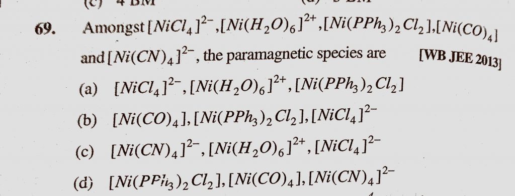 Amongst (NiCl4) 2- , (Ni(H2O)6 2+ , (Ni(PPh3)2Cl2), (Ni(CO)4) and (Ni(CN)4)2- , the paramagnetic species are (Ni(CO)4) and (Ni(CN)4)2- (Ni(H2O)6 2+ (Ni(PPh3)2Cl2) Amongst (NiCl4) 2- the paramagnetic species are December 4, 2020 Category: Uncategorised (JEE Advanced Physics by BM Sharma + GMP Solutions) , Facebook Messenger WhatsApp Share this:TwitterFacebook Related